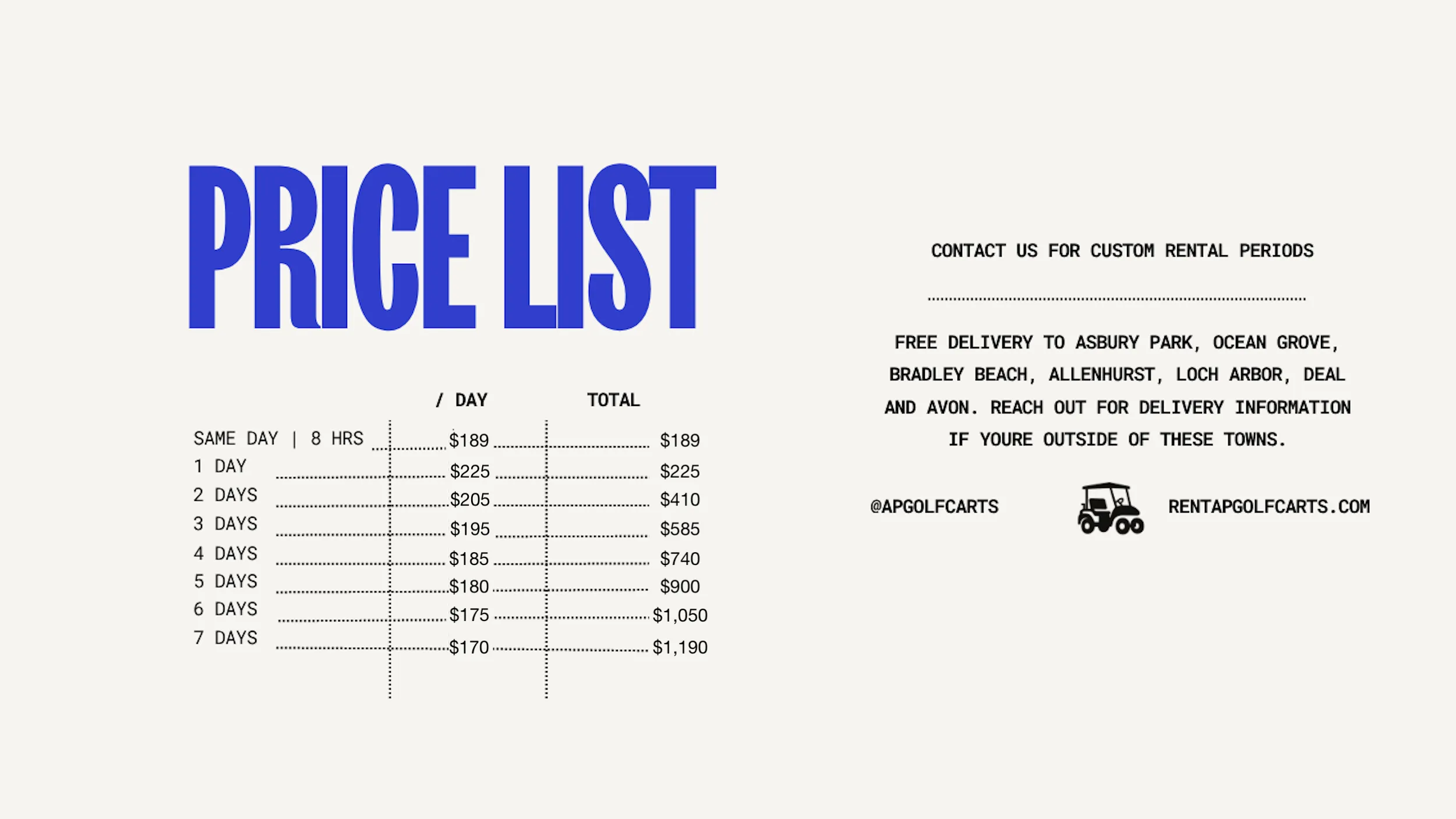 Delivery is free as long as you are in the following towns: Asbury Park, Ocean Grove, Bradley Beach, Allenhurst, Loch Arbor, and Avon. If you need a cart outside this area please contact us! Note - the further you are from Asbury Park, the lower the battery level may be upon delivery, we drive them straight to you.